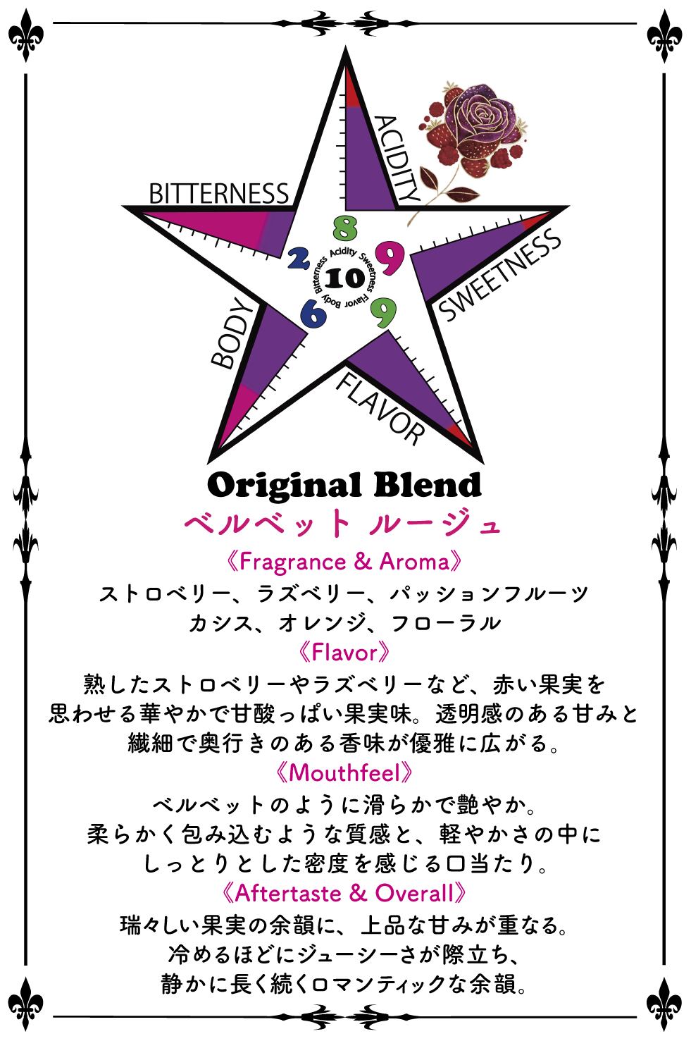 最高等級ナチュラル・モカ エチオピア・イルガチェフェ G-1 と世界最高峰のコーヒー品評会であるベスト・オブ・パナマで1位を獲得した名門超優良ホセ・マヌエル5農園の中の一つであるラ・サンタ農園産の高品質なコーヒーを絶妙なバランスで配合したオリジナルブレンドです。
