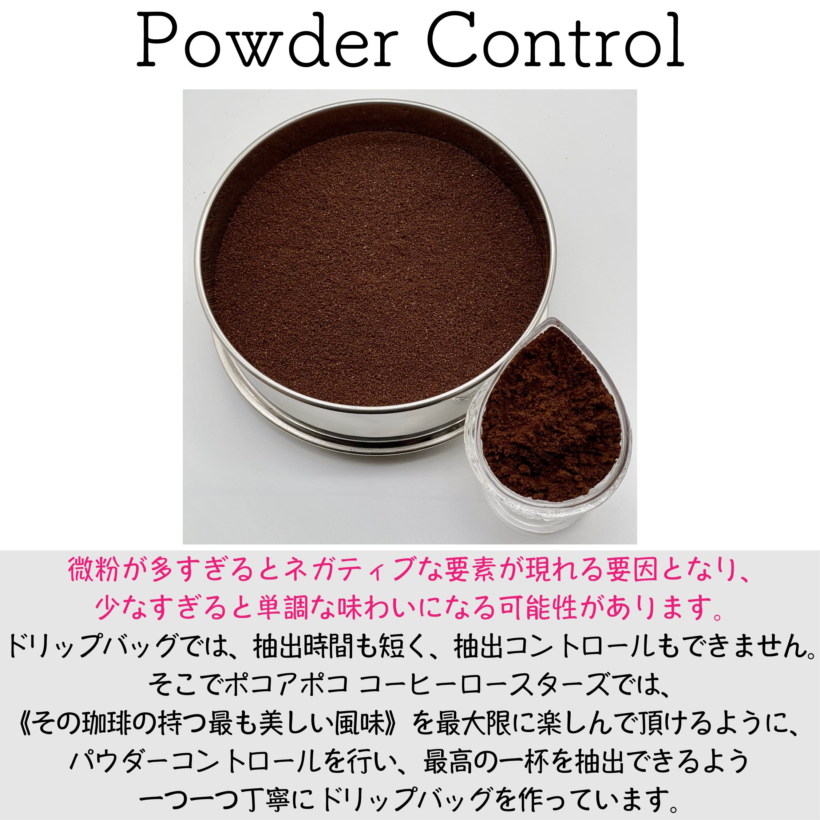 そこでポコアポコ コーヒーロースターズでは、《その珈琲の持つ最も美しい風味》を最大限に楽しんで頂けるように、パウダーコントロールを行い、最高の一杯を抽出できるよう